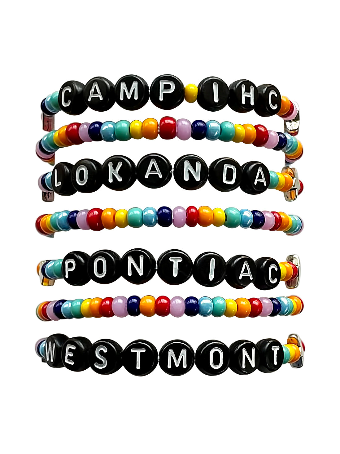 Single Strand Bracelet with Rainbow Pattern and Camp Name in Black/White Letters to show your Camp, School, College or Team Spirit! This can be personalized with anything.