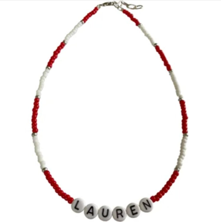 Red and White Beads with Silver Accent Beads, and with Name in White with Black Letters.